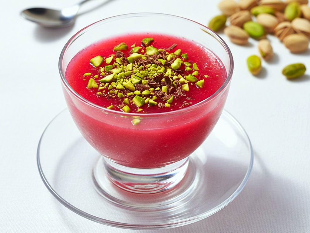 Preparation. Cut the watermelon into small pieces. After removing the peel and seeds, sift the pulp or use a juicer to extract the juice from the watermelon. Pour the juice into a saucepan. Add the starch and sugar, mixing without forming lumps. Put the saucepan over low heat and, stirring, bring to a boil. As soon as the mixture has thickened slightly, add the cinnamon and turn off the heat. Let it cool down a bit and add the dark chocolate flakes while stirring. Pour into cups or molds of your choice and refrigerate for an hour. Garnish with chopped pistachios and chocolate flakes before serving.